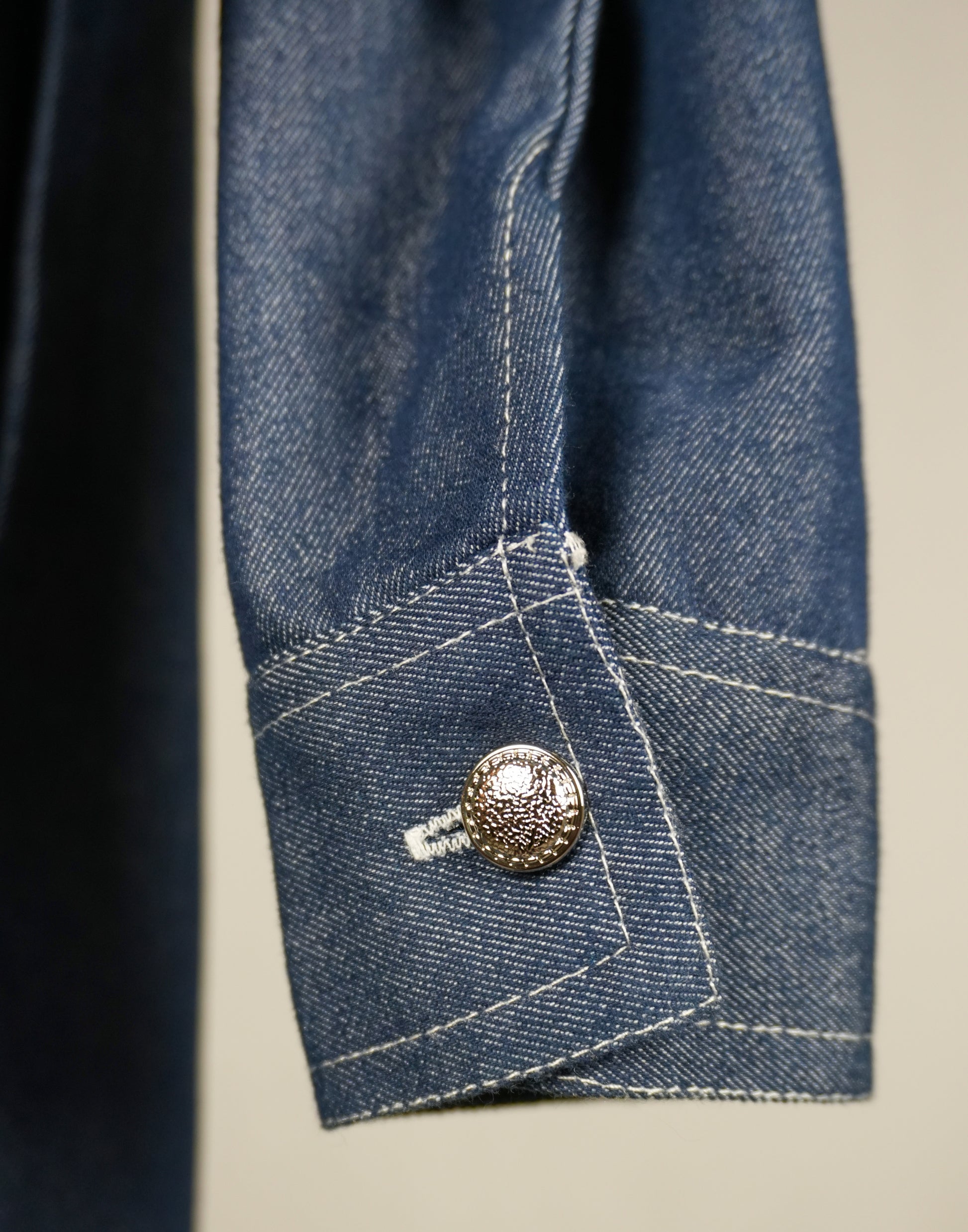 - Metal button front closure