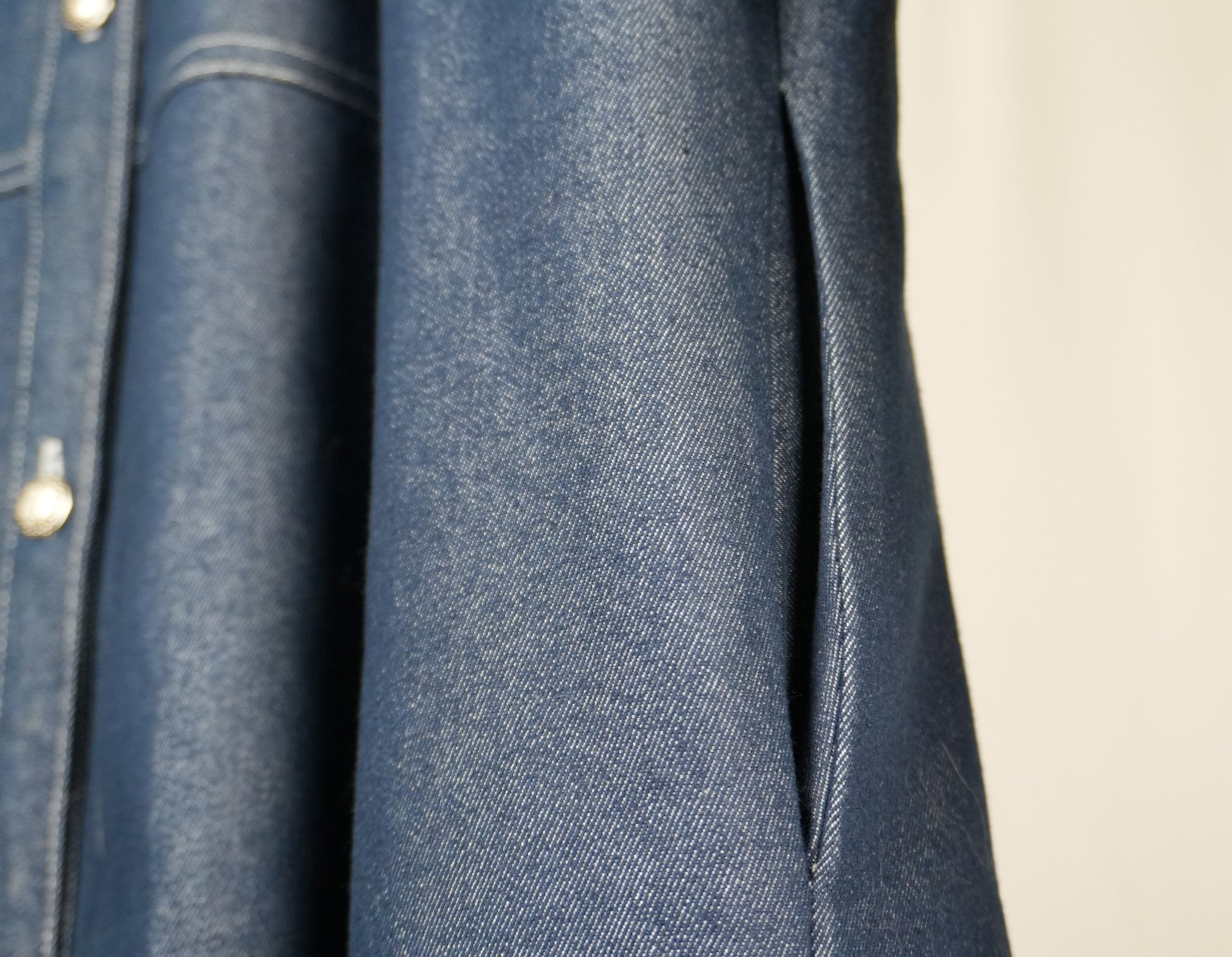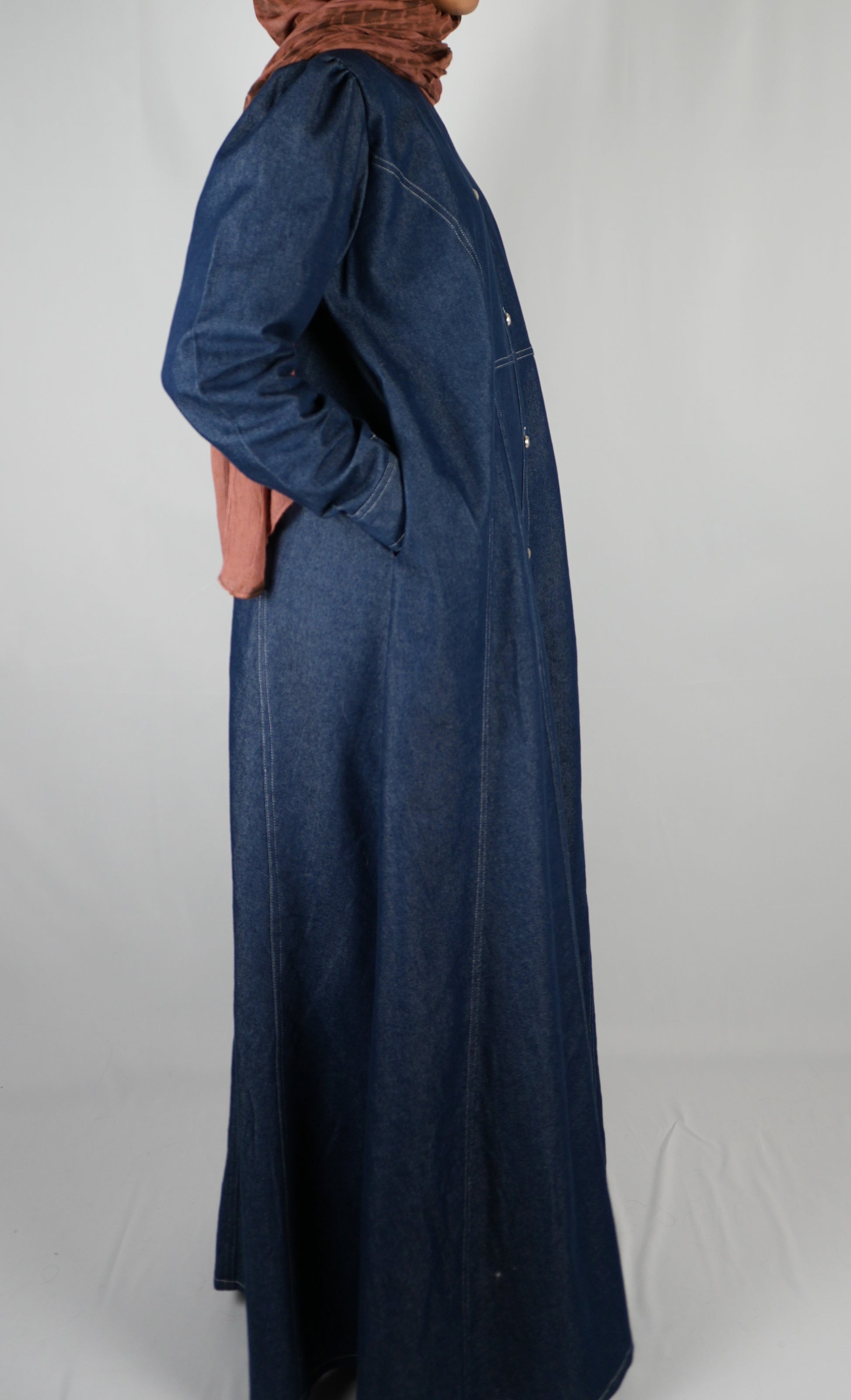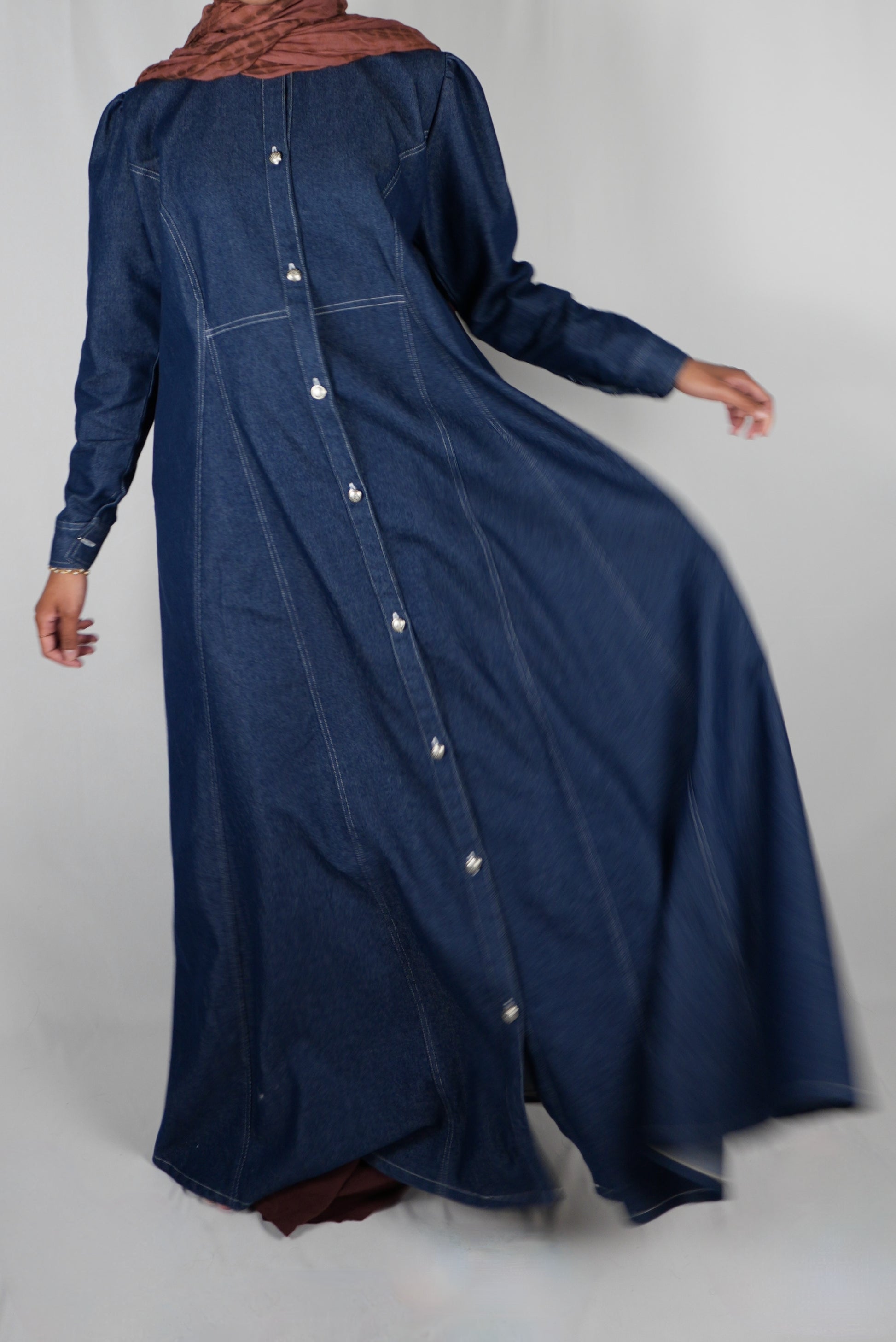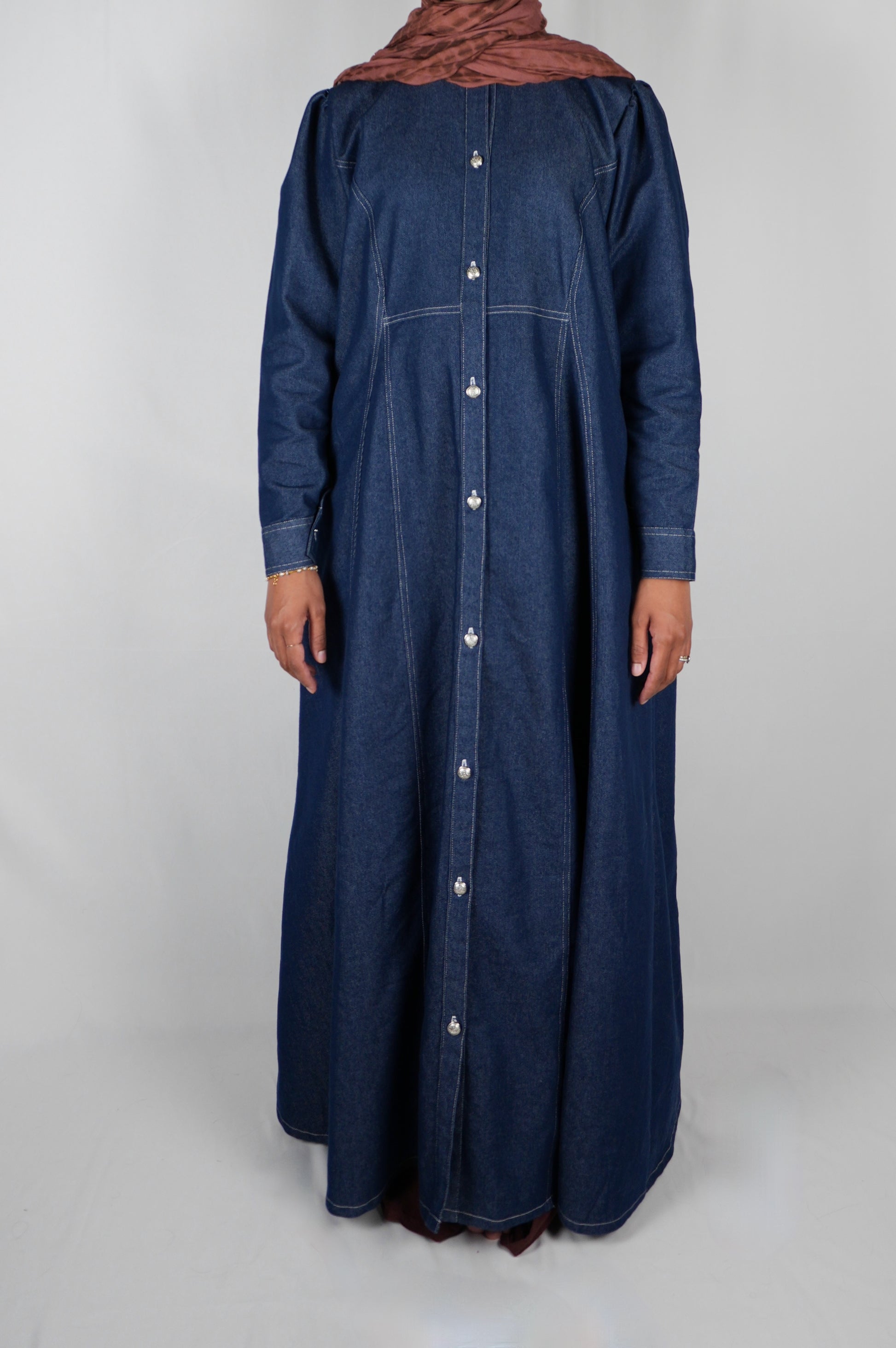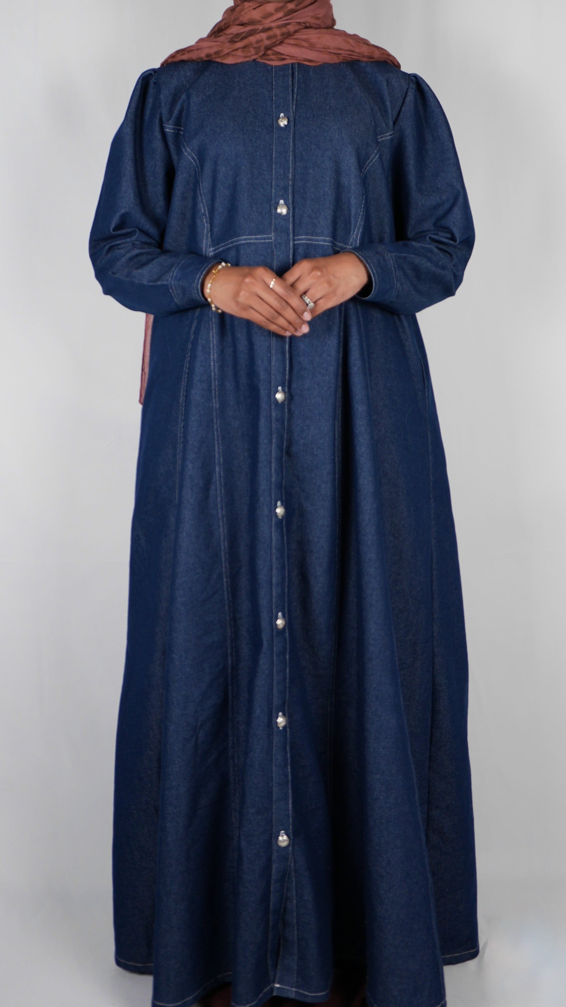 Azra is an A-line buttoned abaya made of a mid weight denim fabric. A classic transitional piece in autumn, this abaya features silver buttons along the opening and on the cuffs. The puff shoulders add a bit of femininity and the pockets make it casual enough to wear to all your autumn activities.