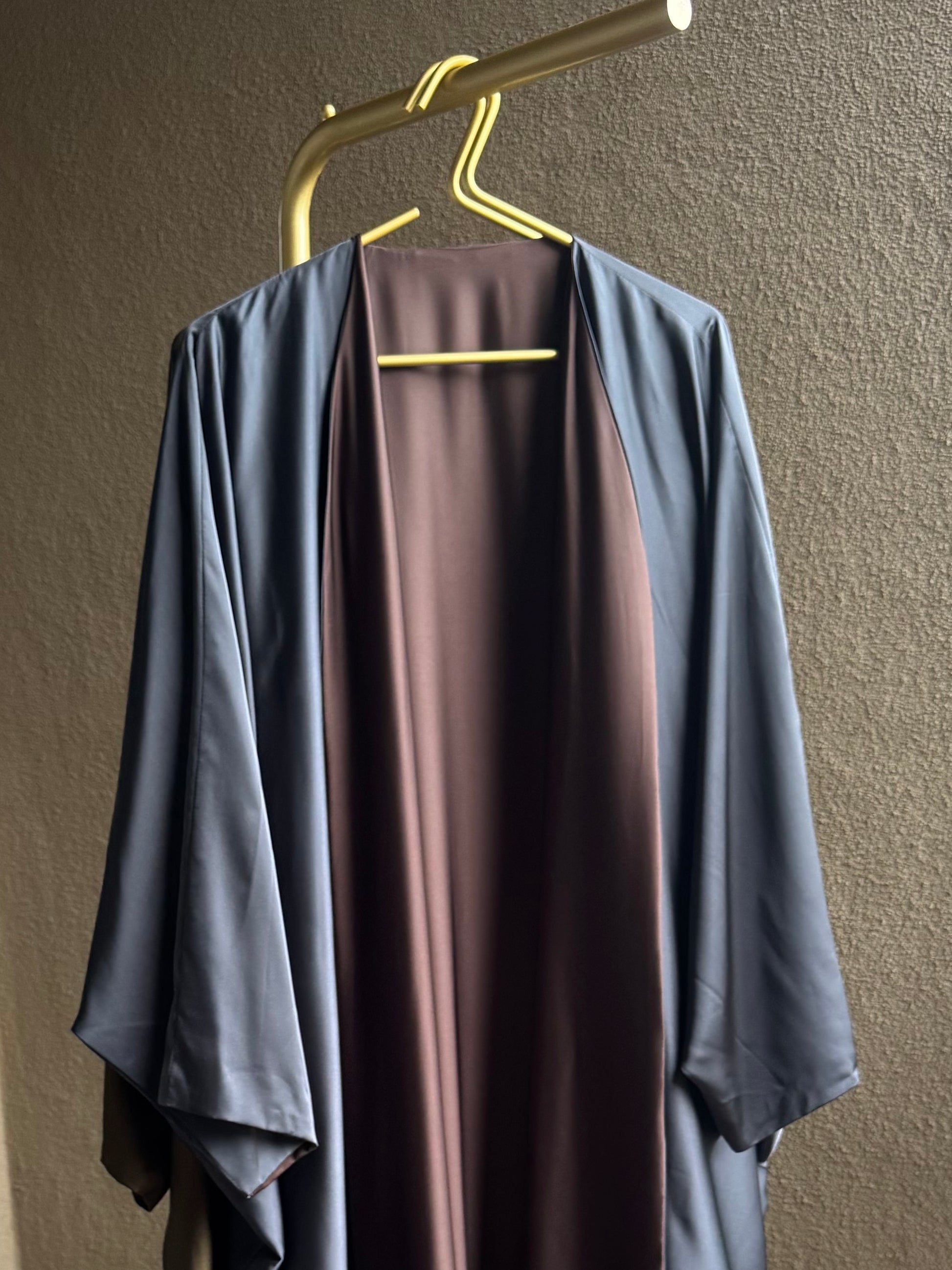 Munira is a farasha style reversible abaya made of smooth, silky textured fabric in vibrant colors. The lightweight fabric drapes beautifully and creates a flattering shape. A versatile statement piece, perfect for special occasions.